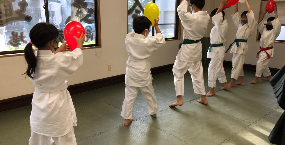 風船を使って、体操や基本動作、入り身投げや四方投げの稽古を行いました。